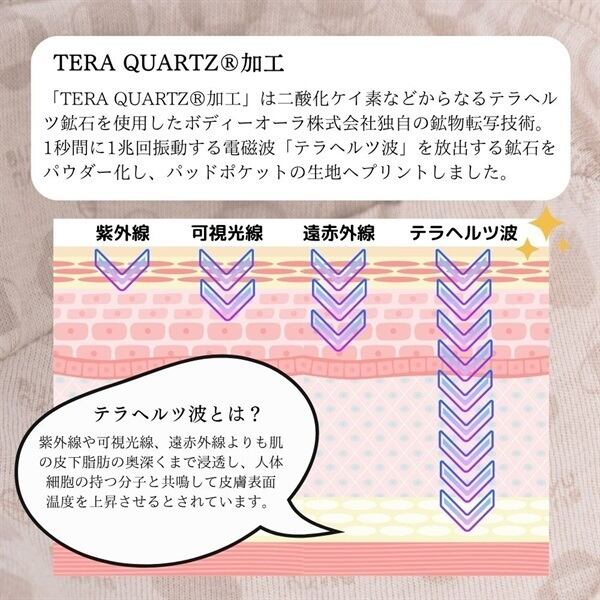 【テラサーモ】BB育乳ブラ グラマーニュは、1秒間に1兆回振動する電磁波「テラヘルツ波」を放出する鉱石をパウダー化し、パッドポケットの生地へプリントしました。着るだけでじんわりとあたたかく、巡りを妨げない環境を整えます。